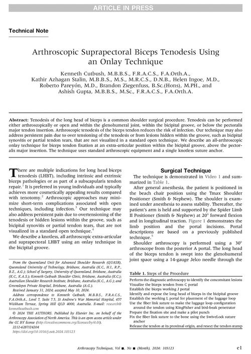 Excited to share that my article on Arthroscopic Suprapectoral Biceps Tenodesis using an Onlay Technique has been accepted for publication by Arthroscopy Techniques. Biceps tenodesis is a crucial procedure in my practice, addressing various biceps tendon injuries like ruptures, SLAP tears, and instability.